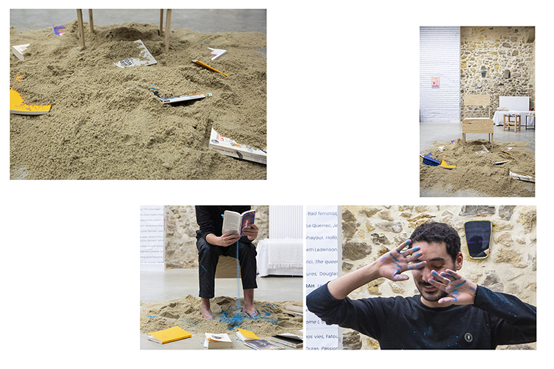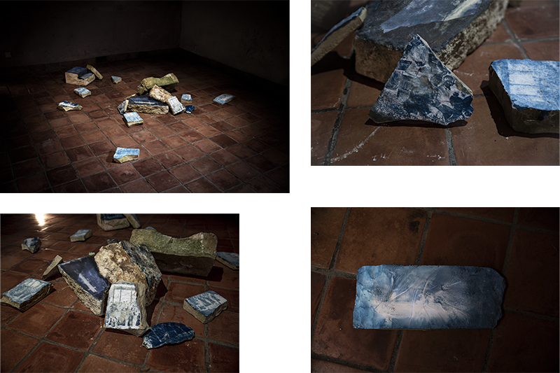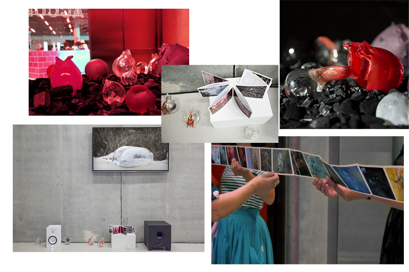 Pièces en verre souflé, table en bois brulé, leporello (16 cartes postales), vidéo